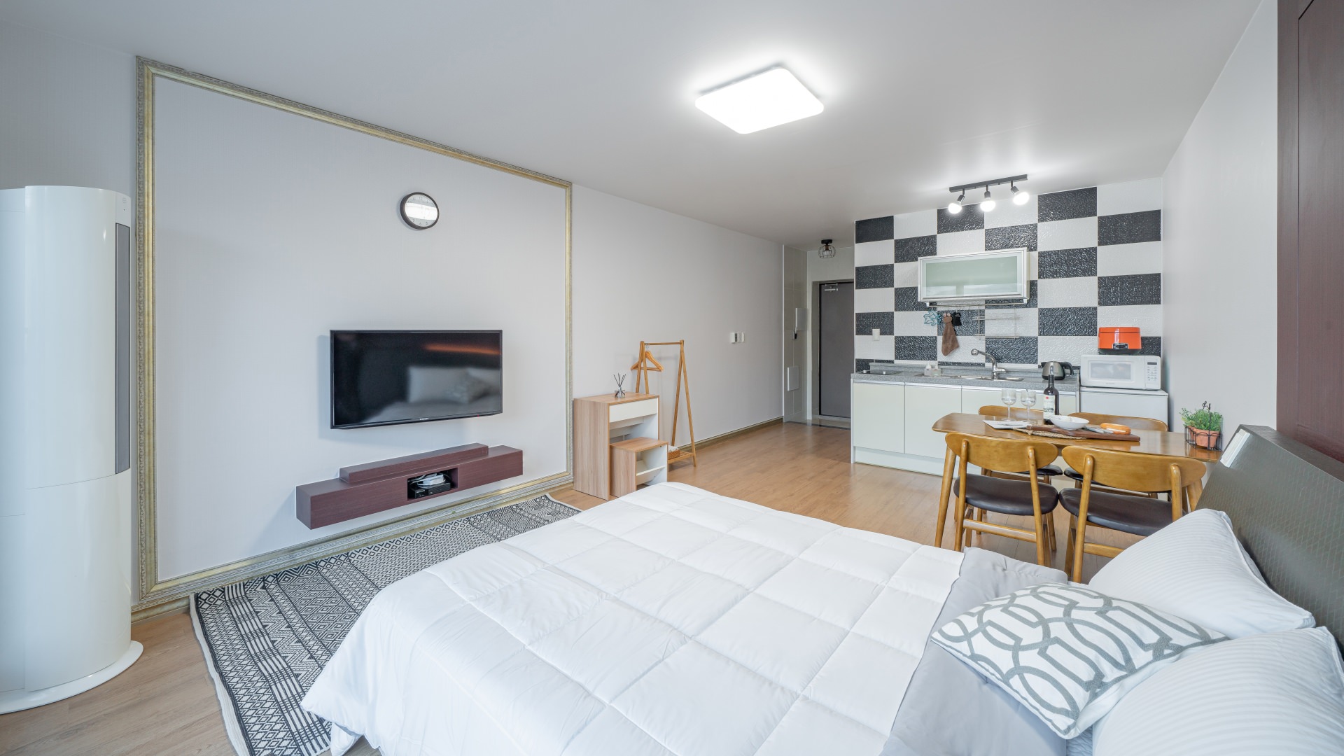 구비시설TV, 침대, 에어컨, 냉장고, 식탁, 전자렌지, 주방기구일체, 식기류일체,기본조미료(소금.후추.식용유), 드라이기, 샤워용품, Wi-Fi